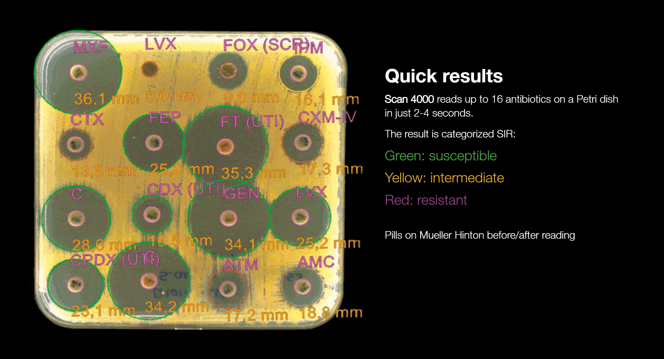 Scan 4000 makes it possible to check the effectiveness of an antibiotic on a microorganism by measuring the zone of inhibition. In addition, it adapts to perform titration and/or antibiotic dosage in the pharmaceutical industry. In the field of animal health, the Scan evaluates antimicrobial resistance with its SIR interpretation.