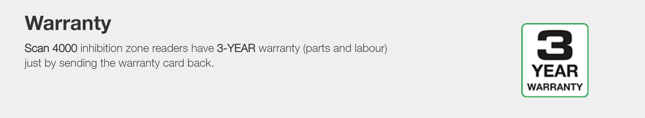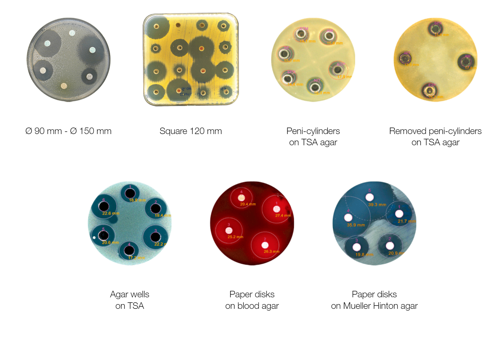 Scan 4000 automatically detects the peni-cylinders, present or removed, made of steel or plastic. It also reads agar wells or paper disks (any brand). Add/remove disks manually.The inhibition zones can also be resized. Scan 4000 allows reading on blood, chocolate or Mueller Hinton agar. In its automatic colony counter mode, Scan 4000 counts colonies on round or square Petri dishes.