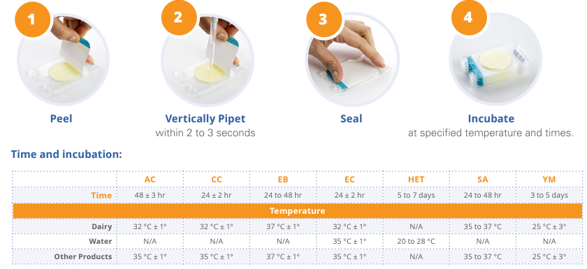 Each single-use microbial test contains prepared media in a shallow dish with an adhesive top cover. To plate a food or water sample simply peel up the adhesive to expose the media, pipette into the center of the plate, and watch the sample wick and spread into the media. The test gels solidify within 10 seconds (30 seconds for High Volume tests). Plates are designed for uniform incubation and air flow and have an air space above growth to allow opening and picking of colonies for additional microbiological procedures and identification.