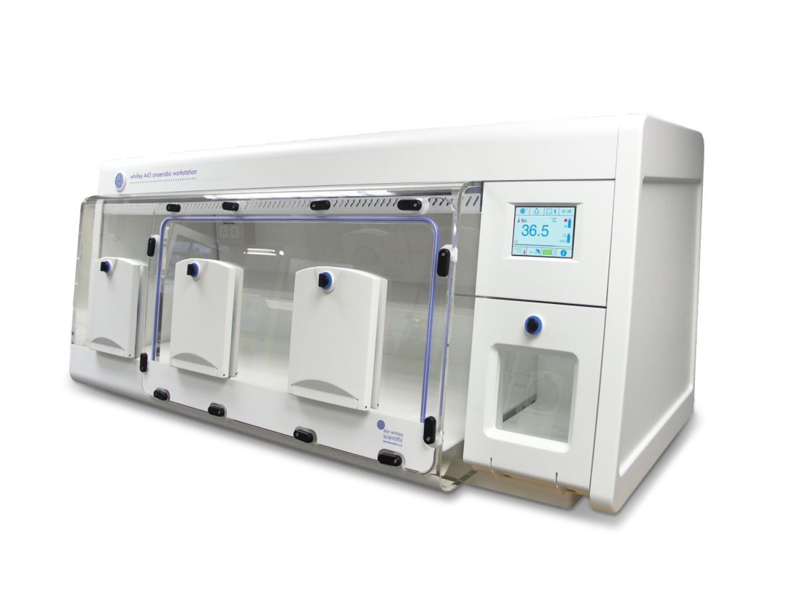 The A45 Workstation, like our other anaerobic workstations, enables the processing, incubation and examination of samples without exposure to atmospheric oxygen. This workstation has three ports for convenient user access to the entire incubation and working areas. The ports can be configured as: